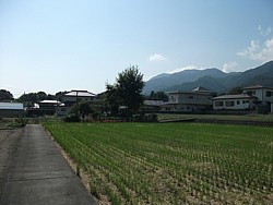 中: 釜無川の畔から願成寺の北側を抜けて武田八幡宮へ、真っ直ぐに2kmの参道が続く。中央奥は千頭星山(2139m)だろうか。