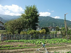 停めて宅地に囲まれた畑の中を50mほど歩かねばならない。しかも案内表示があるだけで、見るべき遺構などは皆無である。八幡宮西側の山地から釜無川に