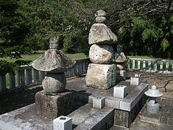 上: 中央の伝・信義の五輪塔は背面、特に笠石(火輪)は後ろ側半分が完全に失われている。周辺には小さな五輪塔も並んでいる。