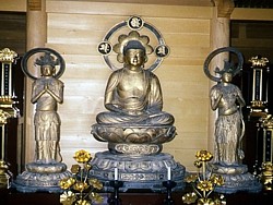 左: 本尊は信義の寄進と伝わる阿弥陀三尊像。中央の阿弥陀如来は約142cm・左の観音菩薩像が170cm・右の勢至菩薩が169cm。