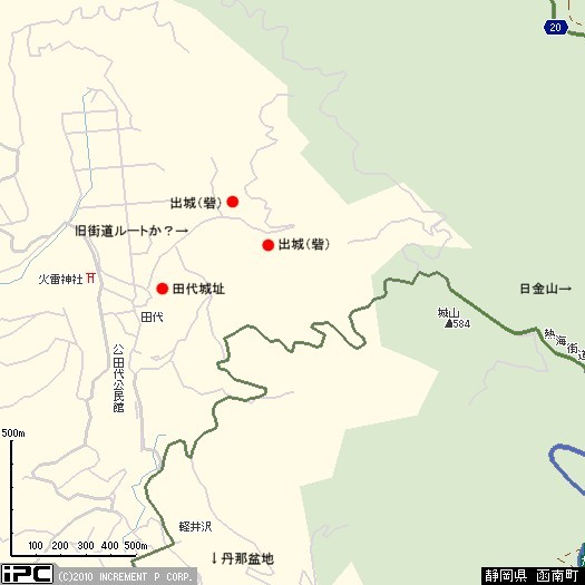 田代城址と出城の位置図。日金に登る旧街道を挟む両側の高みに置かれている。