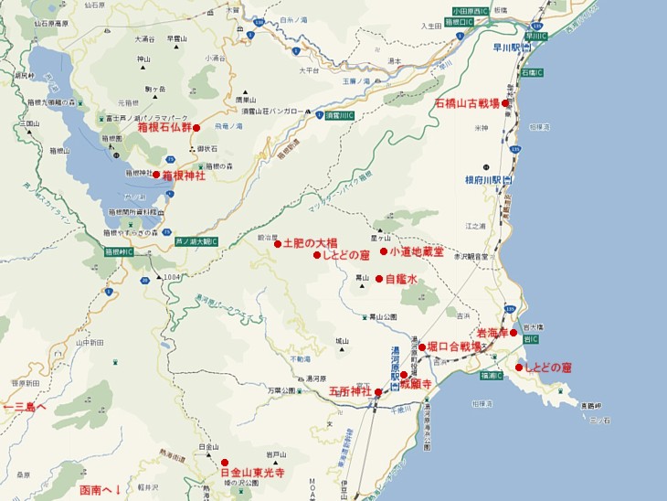 頼朝は日金山→ 五所神社→ 土肥館→ 石橋山→ 堀口→ しとどの窟 →箱根山中→ 岩海岸→ 舟で安房へ