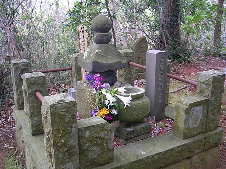 小山の頂上に建つ河津三郎祐泰の墓。鎌倉時代初期以前と思われる古式五輪塔だ。