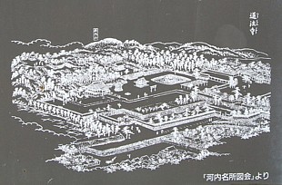 中: 同じく門前の河内名所図会(享和元年・1801年刊行)から転載した全盛時代の境内図。今も残っているのは中央の鐘楼と山門だけで、