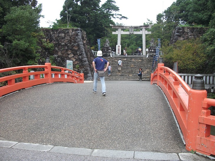 神橋を渡り左右の石垣に挟まれた石段を登って神域へ。右側の参拝者用スペースに駐車できる。