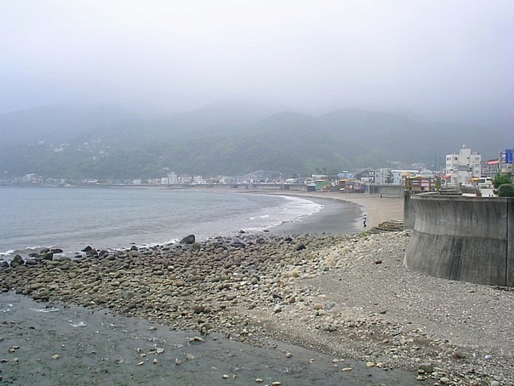 宇佐美城山の横で海に流れ込む烏川の河口から宇佐美の浜(伊東方向)を見る。
