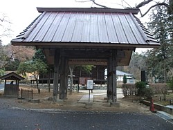 中: 山門の前から参道入口を見る。右手の小道を入った右側が鶴亀の池、直進した突き当りに宇都宮氏の墓所がある。