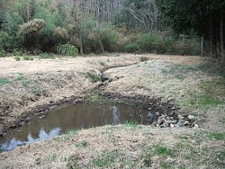 上: 綱神社参道の鳥居左手に浄土庭園の痕跡があり、鶴亀の池の一部が確認できる。足利義兼が隠居所とした樺崎寺(別窓)と同様に、
