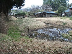 左: 鶴亀の池の奥から。宇都宮一族の廟所は右手人家の裏手、綱神社と大倉神社は左斜面の上にある。池の奥側に多宝塔の跡、画像右側の