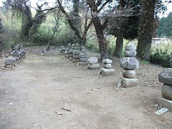 左: 廟所の最も奥を背にして右側部分を。南側(左)から、15基・7基・2基の五輪塔や板碑が並んでいる。