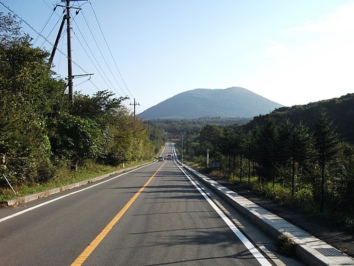 人穴から牧場が点在する県道71号を北上、正面には富士山の側火山大室山が聳える。