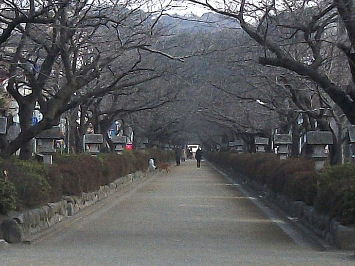 二の鳥居から八幡宮社頭へ続く段葛。4月の初旬には桜が咲き、ライトアップされた八幡宮が浮かぶ。