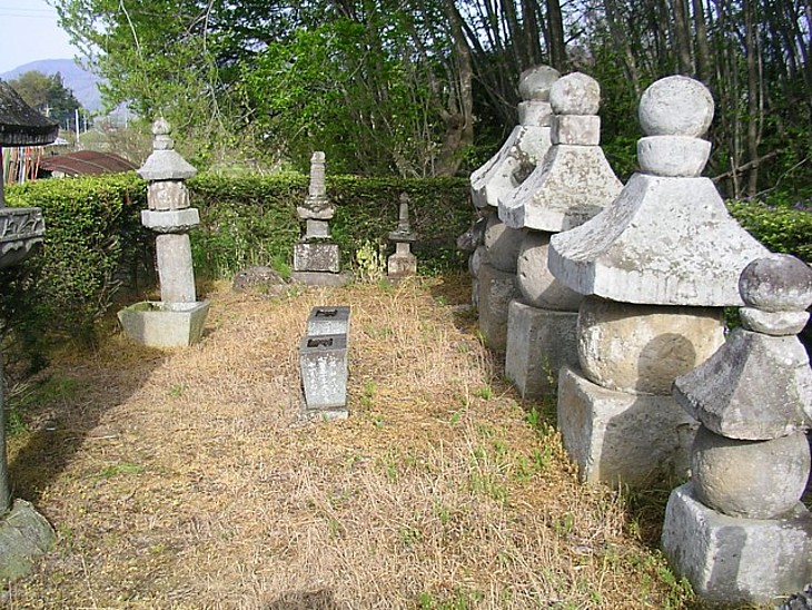 右側手前の小さな五輪塔が義定と殉死した家臣を葬った後に殉死した伊勢坊玄海法印の墓標。