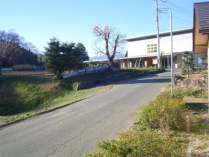 北側から。正面のふるさと歴史館を左折すると舗装道路が大手虎口へ続く。