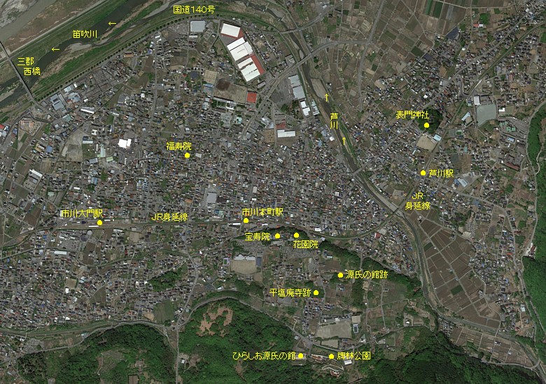 南側からの鳥瞰。平塩寺は天正年間(1582年頃)に廃寺となり一部堂塔は丘陵を離れ平地に移転した。