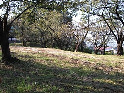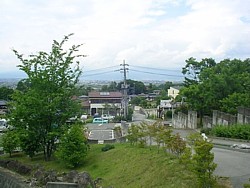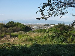 中: 大門碑林公園 と ひらしお源氏の館 前の駐車場から源氏館跡の方向(中央に見える森)を。館の跡から笛吹川までの標高差は約40m。