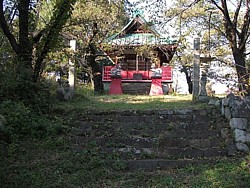 右: 石碑西側の熊野神社。義清が平塩周辺の地の神を集め甲斐源氏の守護神として祀ったのが創建と伝わる。社殿は江戸時代末期の建築らしいが、