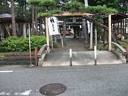 中: 狭い堀に囲まれて静かな佇まいを見せる義清神社。この堀を館の防御を兼ねた濠だったと見るべきか、或いは単なる水路と見るべきか。