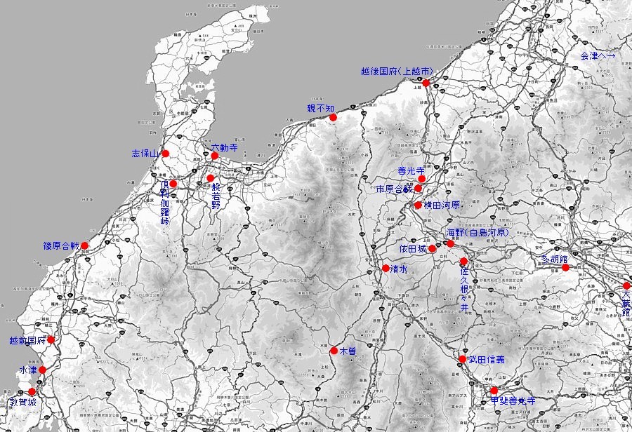 義仲の行動地図 木曽から多胡館・倶利伽羅峠を経て京都に向って進軍。