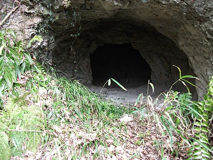 中腹の平場に見える開口部が「伝・義時のやぐら」。地元には「よしときさん」の呼び名で伝わっている。