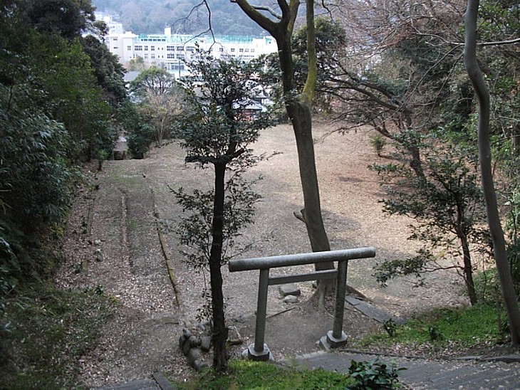 島津廟の手前から法華堂跡を。背景は清泉小学校(大倉御所跡)、頼朝の墓から直線で僅か100mだ。