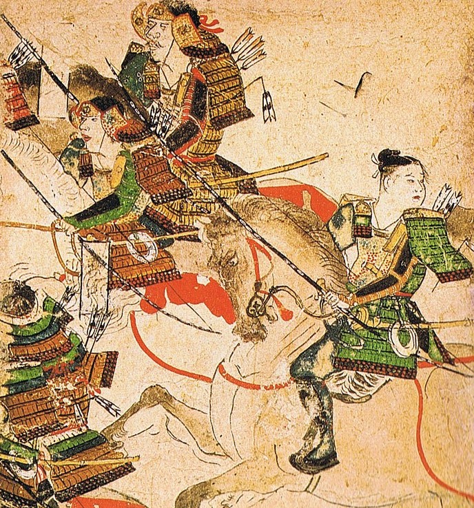 平治物語絵巻より 敗走する義朝主従(奥が義朝・右手前の少年が頼朝・左は義平か朝長か)