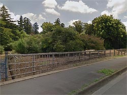 右: 城跡から少し南に歩くと掘割らしい窪地に雰囲気の良い石橋が架かっている。その先の左角に中古の売家があったので暇つぶしに見学してみた。