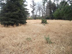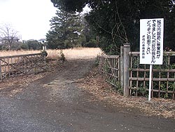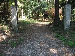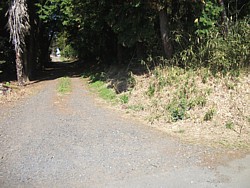 中: 石柱の前から西側・駐車場の南側まで、辛うじて車が通れる巾の小道が続く。右側(敷地の南端)には1m弱の土塁が残っている。