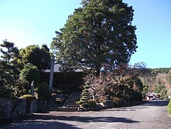 右: 庫裏裏手の小道に菖蒲の墓に至る石標があるが、登りつめた上には広い舗装道路が通っている。墓所はその上の高みに設けられている。