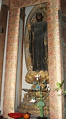 左: 禅長寺本尊の阿弥陀如来立像(台座を含め約150cm)を挟んで左側に菖蒲御前像(1139〜1227)・法名は九華院殿本覚西妙大姉、