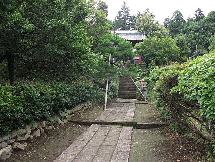 中央の凹地から参道へ、更に石畳を経て山門への石段が続く。左右に広い駐車場あり。
