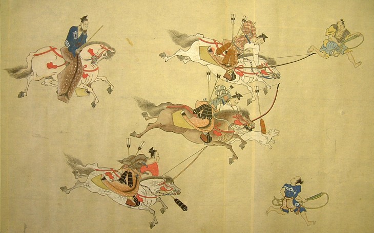 流鏑馬や笠懸と並ぶ騎射三物の一つ。最大の場合は40間 (約72m) 四方を囲って馬場とし、12騎×3組の騎馬武者が競う。