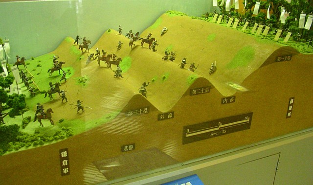 資料館の防塁ジオラマ。距離感はやや雑だが縮尺は冒頭に載せた堀江繁太郎の測量図を元にしている。